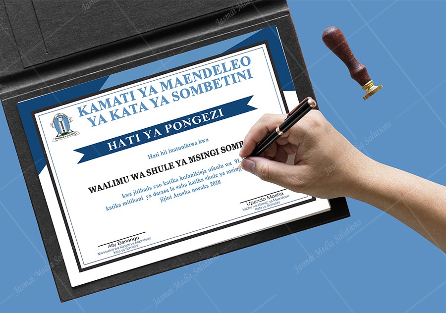 kata ya Sombetini Certificate of appreciation designed and printed at Jasmai Media Solutions